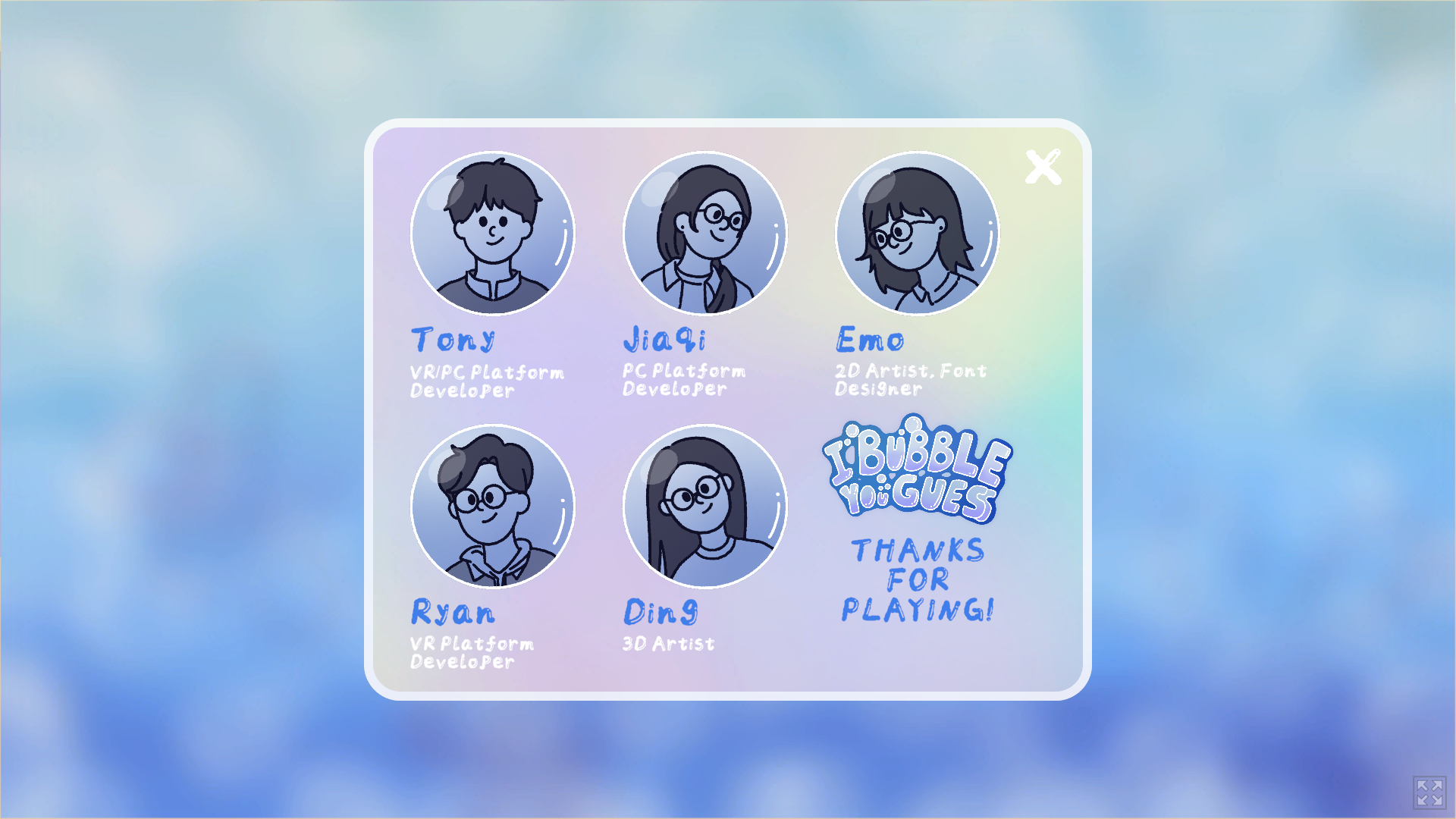 "I Bubble You Guess"是一款3D版你画我猜游戏,最适合与朋友或家人一起体验。 在“I Bubble You Guess”,你可以缩放、移动、搭建、删除泡泡,创造生动有趣的3D物体,供好友竞猜。 我们的灵感来源于《海绵宝宝》。像海绵宝宝一样,自由发挥你的想象力,创造出奇妙有趣的泡泡,在与伙伴们的欢声笑语中收获无限快乐吧!