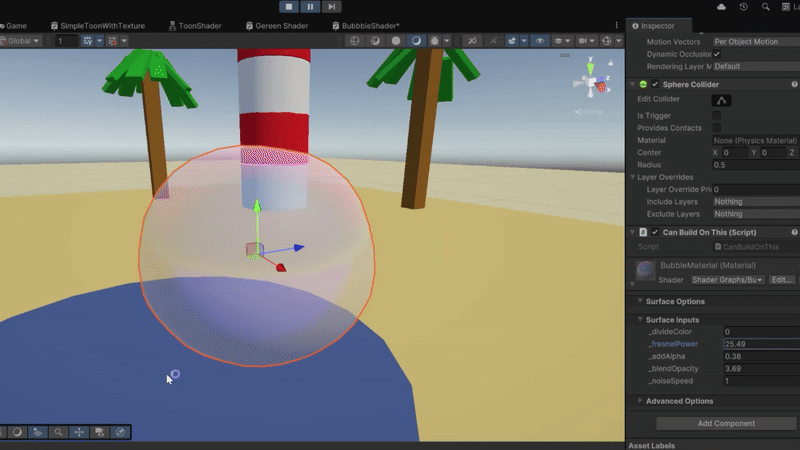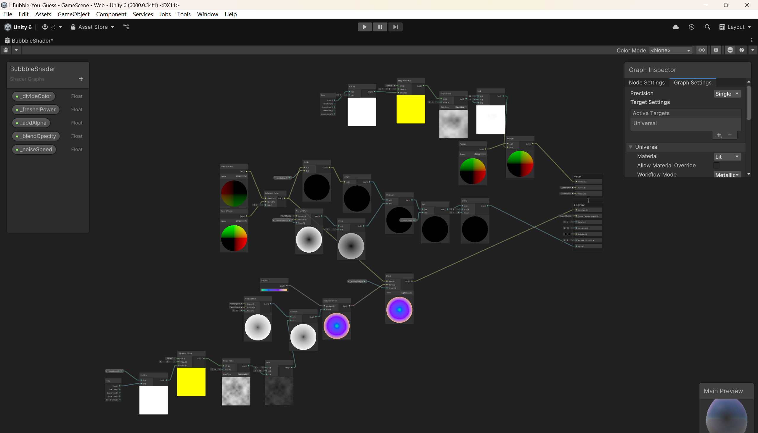 除了完成游戏的全部UI交互逻辑、部分泡泡搭建逻辑以外,我还负责开发了游戏中的泡泡着色器,主要借助Unity的ShaderGraph工具实现。该着色器支持多项参数调节以达成理想视觉效果:
