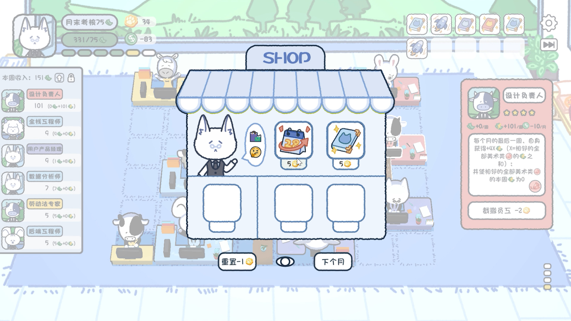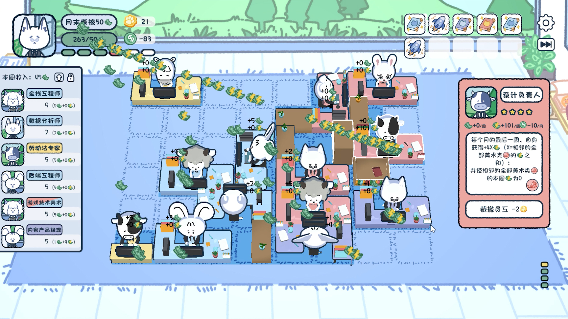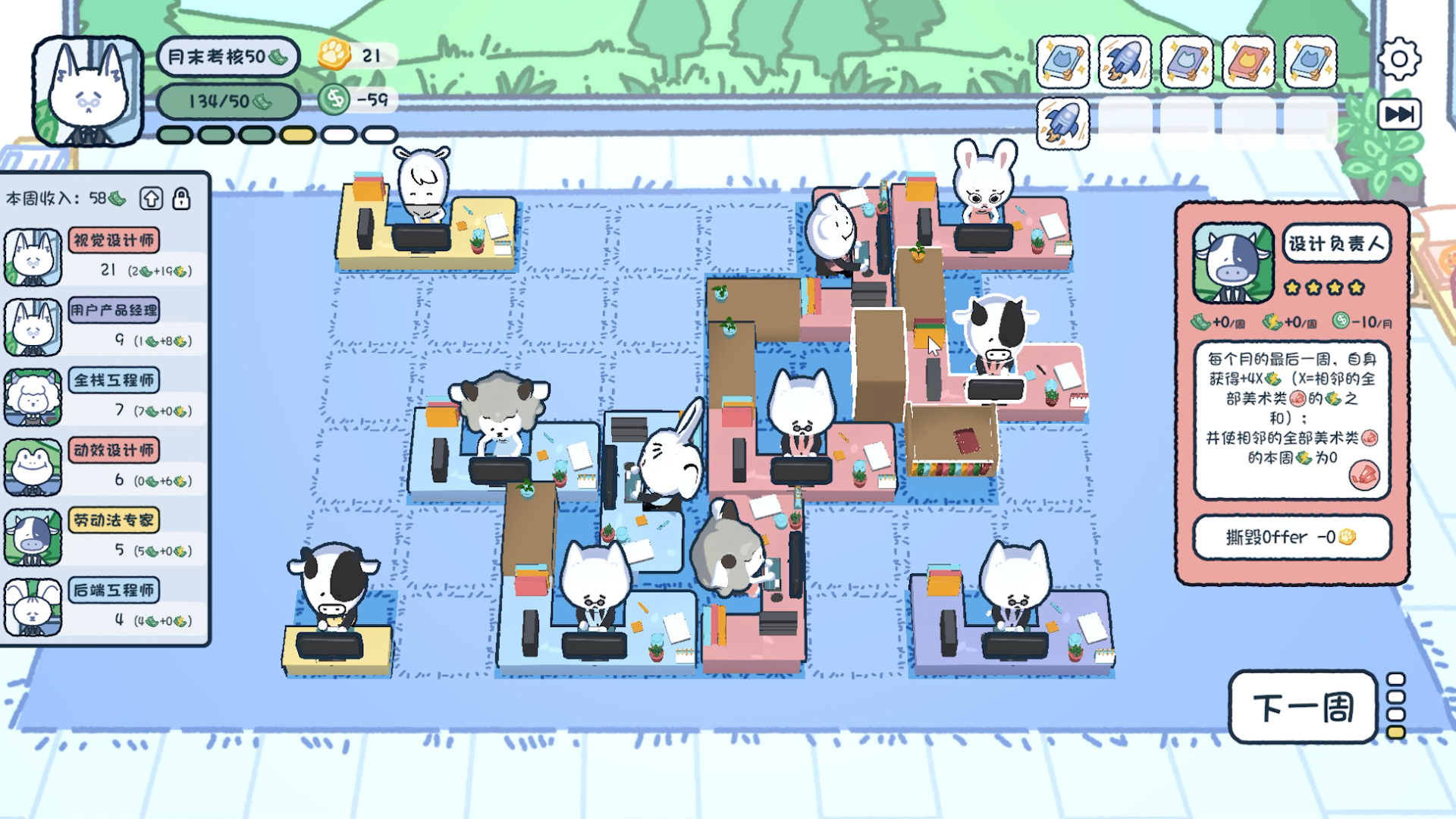 《猫猫直聘》目前包括了约50名员工和约10种道具,各自拥有独特的技能,还在持续开发中。我独自完成了游戏的全部程序开发工作, 包括但不限于: